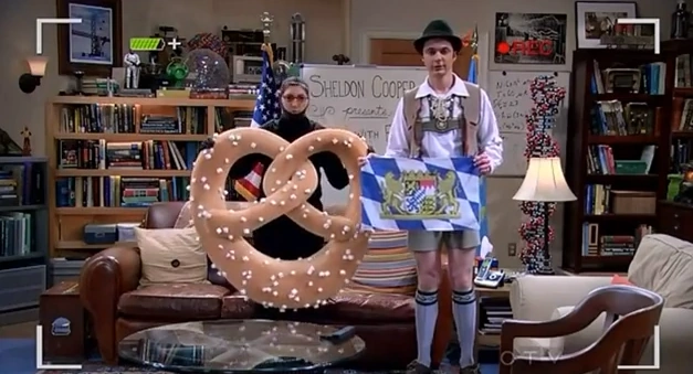 Finalmente cuando Leonard regresa de una cita, encuentra en la sala del Apartamento 4B a Sheldon y a Amy vestidos como un alemán y un pretzel y hablando alemán, aunque gramaticalmente incorrecto.