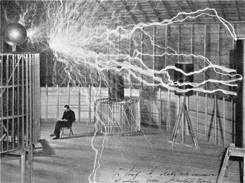 Nikola Tesla Lab poster Image shows Serbian physicist Nikola Tesla at his lab in Colorado Springs, circa 1899. Located to the right of the closet, above the DNA helix. |
