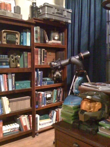 The wall immediately to the left after entering the apartment has a long bookshelf that ends at a small closet, with the wall itself ending at a large window with a desk and telescope. These bookshelves, behind the couch, serve to hold the boy's vast collection of books, some {w|software}, as well as an ever changing selection of their various collectibles. Pasadena City Hall can be seen from the window at the alcove, which has been used on several occasions: