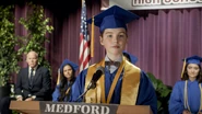 On graduation day the principal introduces Sheldon with an introduction Sheldon wrote. His speech makes him nervous, so he focuses on Missy and thanks her for helping him get through this. The speech talks about change and not being alone. They should all be as brave as Missy and he will give her advice if she makes it to high school since he skipped middle school. We then see Missy and her class perform with Sheldon and Missy sharing a twin look.