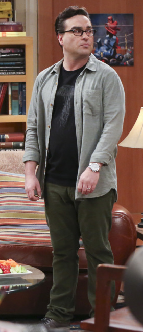 Leonard is usually seen wearing his characteristic black-framed glasses, neutral-colored jackets or vests over a hoodie, low-cut black Converse sneakers, brown trousers, and physics-themed t-shirts. Along with his fashion choices, including mismatched color schemes, he sometimes applies an absurd amount of hair gel; however, his girlfriends often buy him new clothes, and he has put aside his corduroy suit for formal occasions to don a fancy silk shirt and vest or blazer, much to Penny's approval. His formal suits style improves with time. He always wears his hoodies because Sheldon has the thermostat set so low.