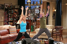 Penny and Sheldon doing "Warrior 2"