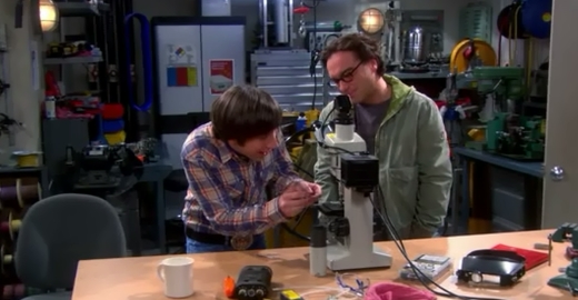 In his lab, Howard creates a micro-valentine present for his microbiologist wife. Over 12 hours, which really took time away from his video game playing, he used an atomic force microscope from the materials science lab to write his and Bernadette's initials in a heart 1/1000th the size of a grain of sand. Leonard adds that it's from a micro-husband. Howard then accidentally breaks his gift when he removes it from the microscope, so Leonard invites them to come to dinner with Penny and Leonard.